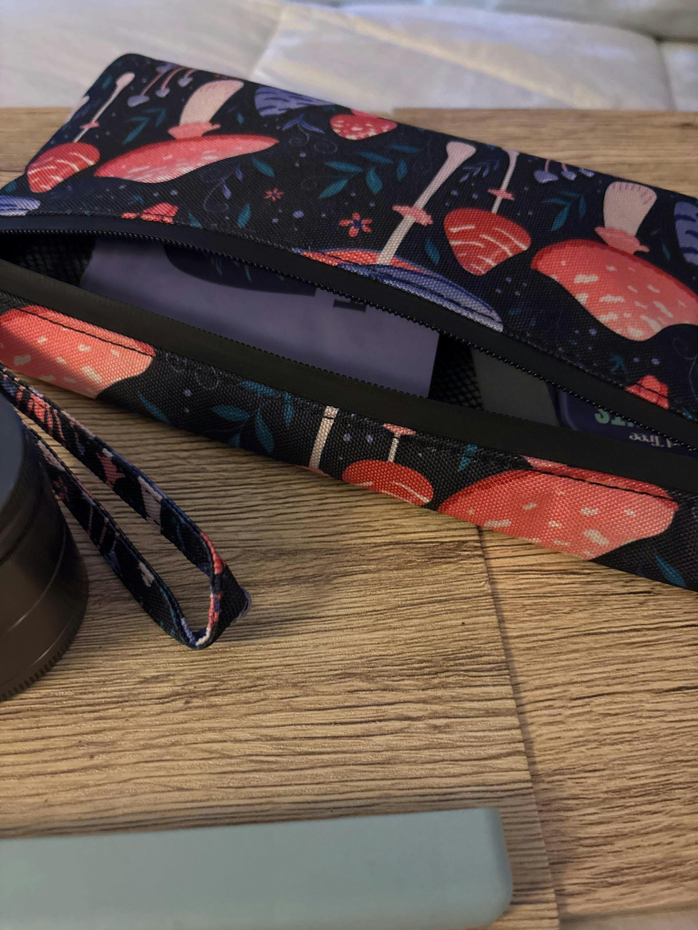 Smell Proof bag with a unique mushrooms design by Mee Mee. Made of high quality material and lockable zipper, great for keeping your secrets, can be used as a clutch pouch or makeup bag, good for travel.